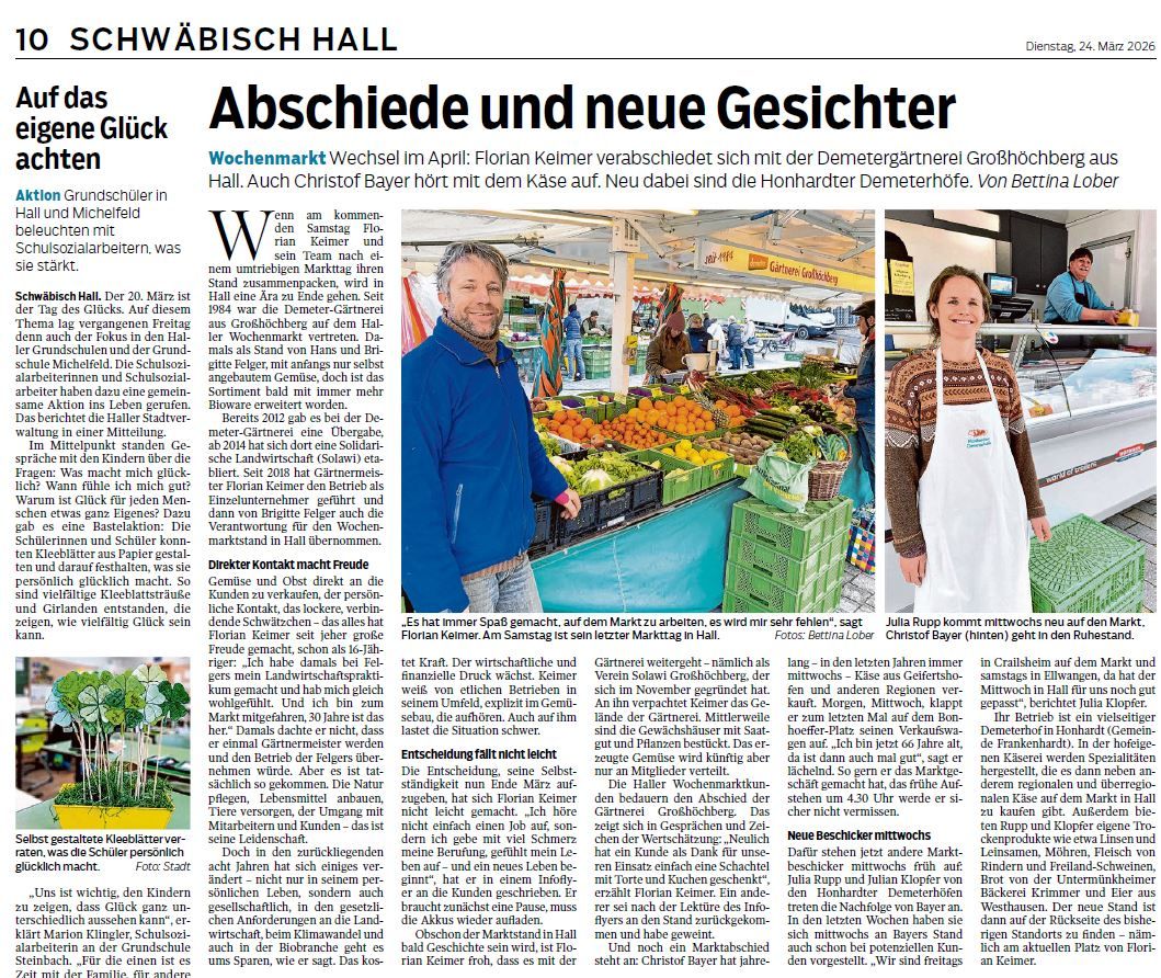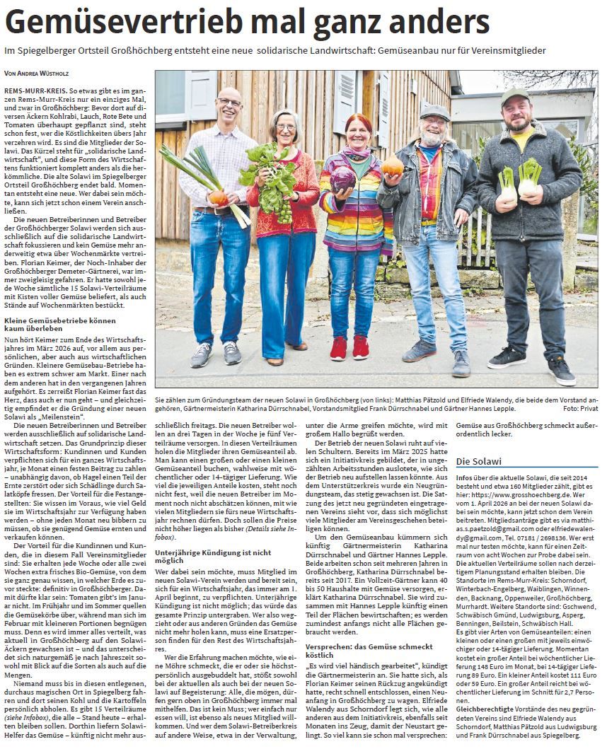 In den „Schorndorfer Nachrichten“ erschien am 26.11.2025 ein Artikel zu meinem Entschluss, die Gärtnerei Ende März 2026 als Einzelunternehmer zu beenden und der Entschluss von Gemüseliebhaber, die Gärtnerei als Verein zu führen; Mit dem Titel: „Gemüseliebhaber retten ihre Gärtnerei“