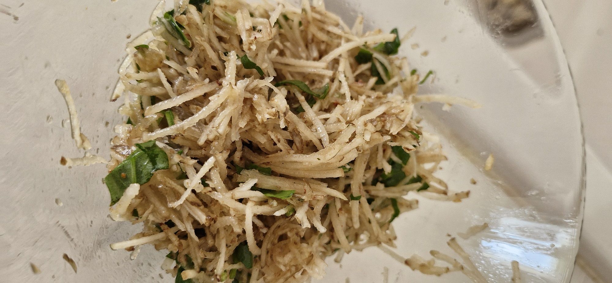 Topinambur fein reiben. Salz, Pfeffer, Olivenöl, Zitronensaft und fein geschnittenen Rucola dazu… Voilà. Mal etwas anderes!